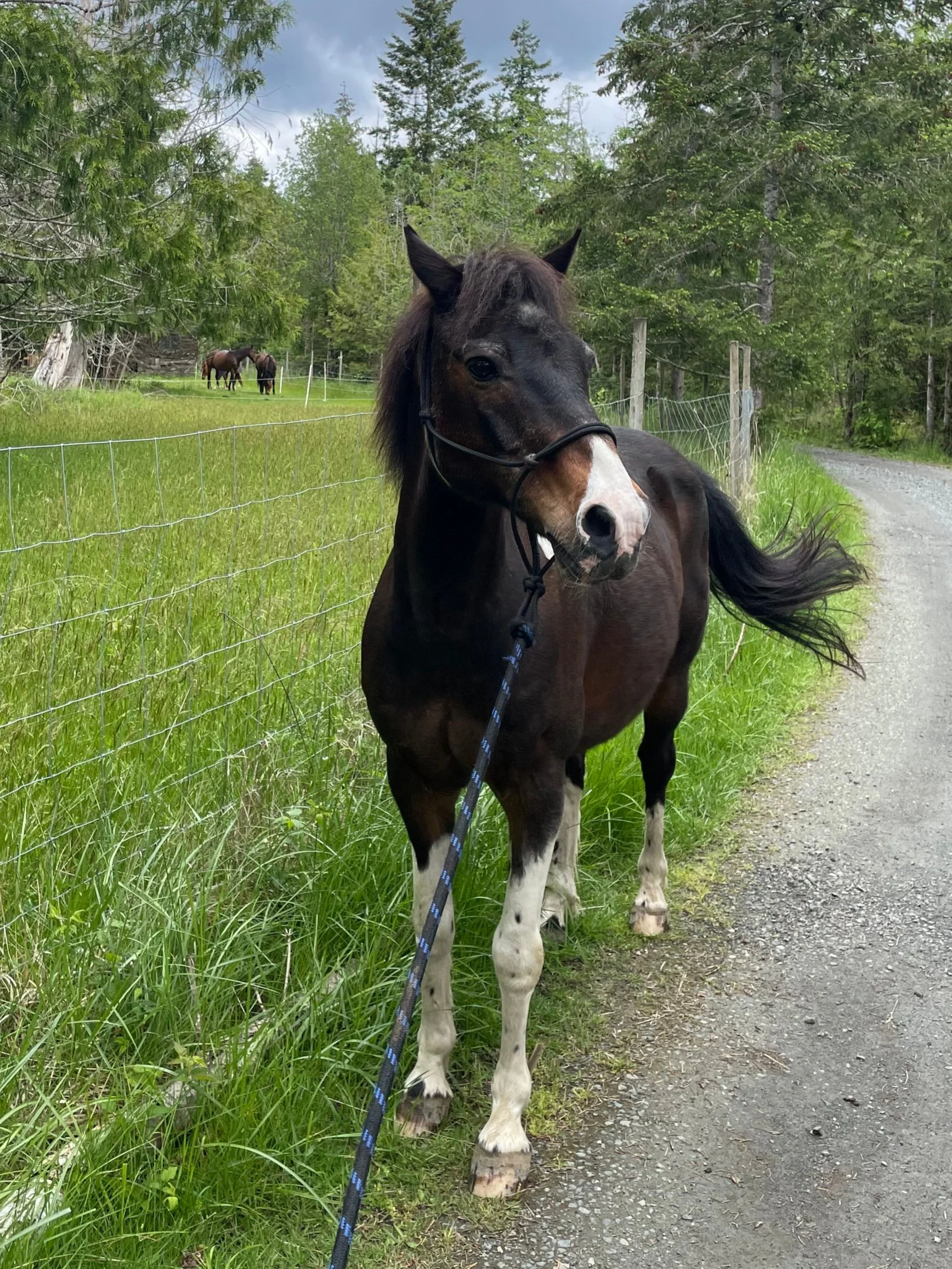 Rue is our little princess pony. She is the only mare in the herd, and she is the ultimate kids pony. This tiny lady can do it all! Toddler pony rides, jumping lessons, trail rides, groundwork games, you name it she’ll do it! You may recognize her from another barn in Qualicum, she was a lesson pony for years at Natural Horse Styles before she came to us.
