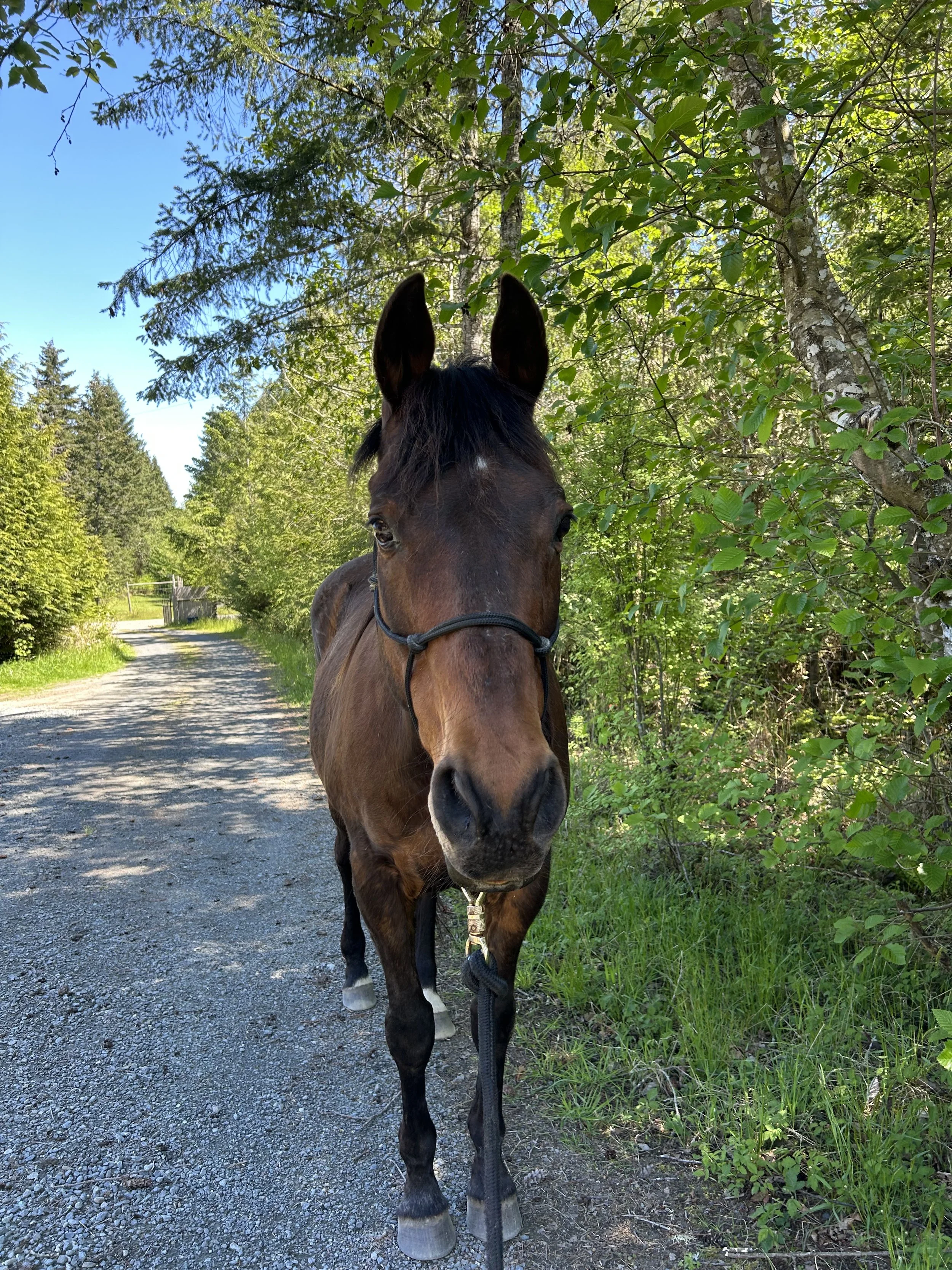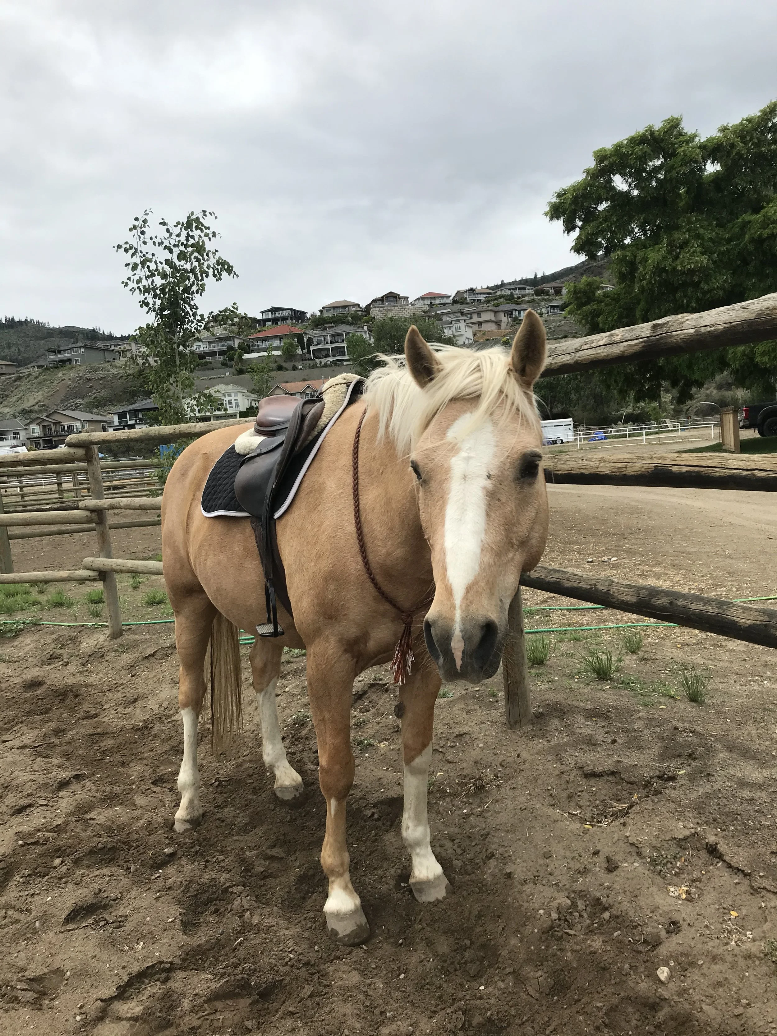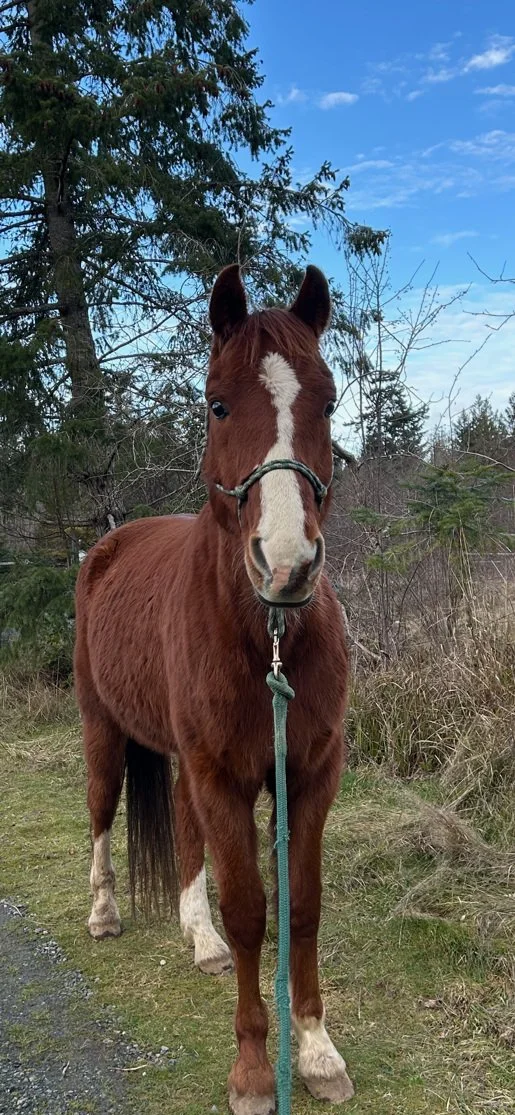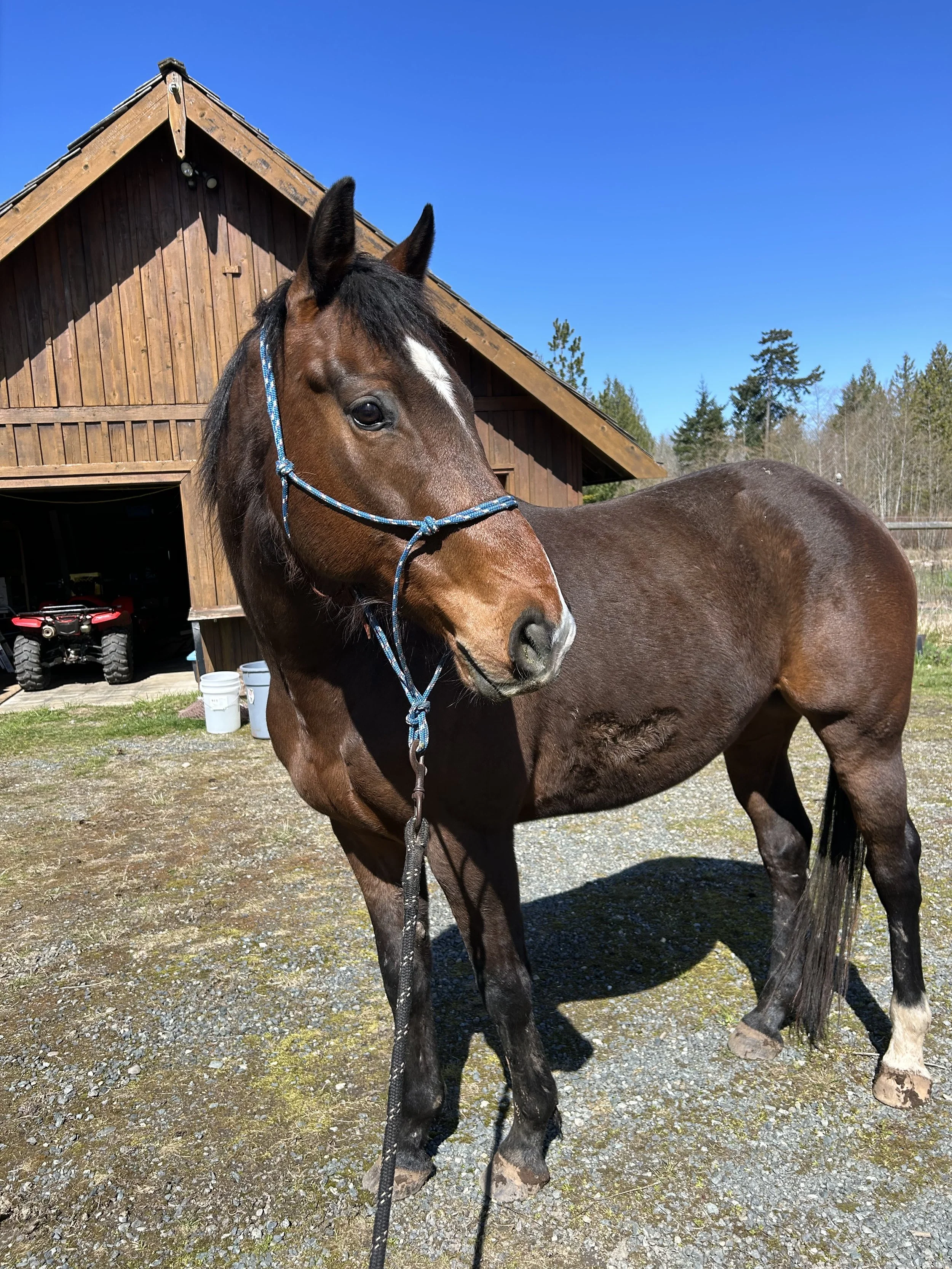 Bueno is an ex-race horse, he retired from the track in the fall of 2021. He then came to us in 2023 from our good friends at Sunhills Riding in Osoyoos. He has a lot of trauma from his early life that we have been working through. He is a very special horse, however he is not ready to participate in lessons yet. You can usually find him glued to Spencer’s side.